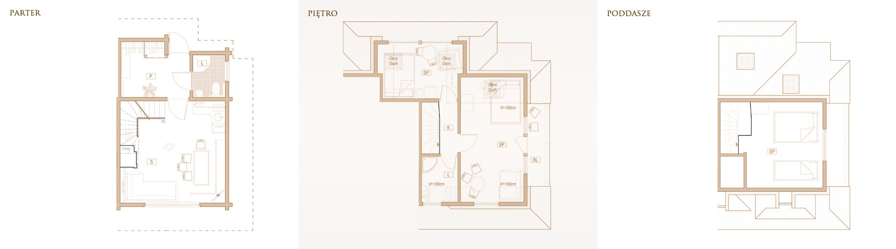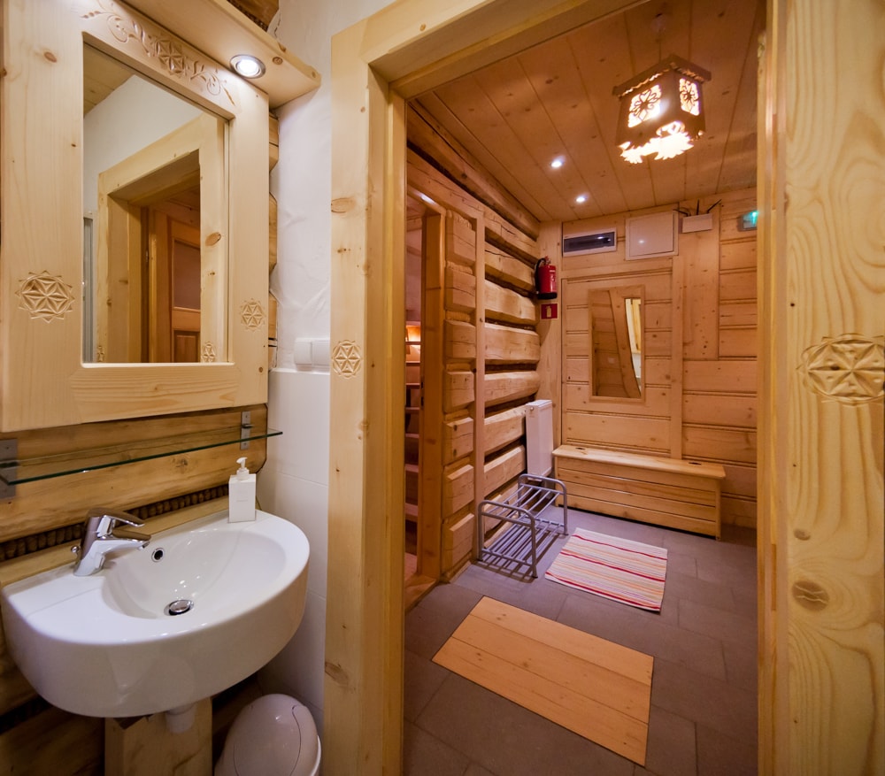 Składa się z salonu z pięknym stylowym kominkiem, dużym biesiadnym stołem dla wszystkich mieszkańców, w pełni wyposażonym aneksem kuchennym, łazienką i przedsionkiem z podgrzewaną podłogą na buty, odzież, sprzęt sportowy, wózek dla dziecka itd. W domku znajdują się trzy sypialnie oraz dwie stylowe, niezależne łazienki dla komfortu Naszych gości. Na poddaszu znajduje się pokój w skosach dla 3 osób. Powierzchnia całkowita domku to 75 m2.